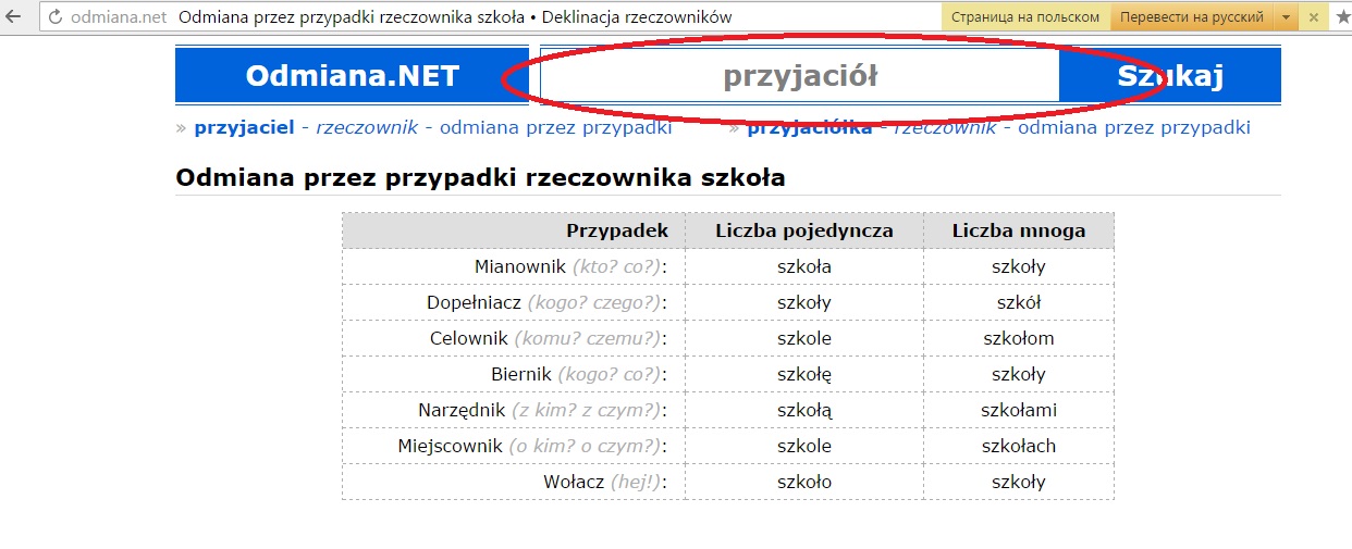 Вверху есть поле, в которое нужно внести польское слово, падежные формы которого вам не терпится узнать.