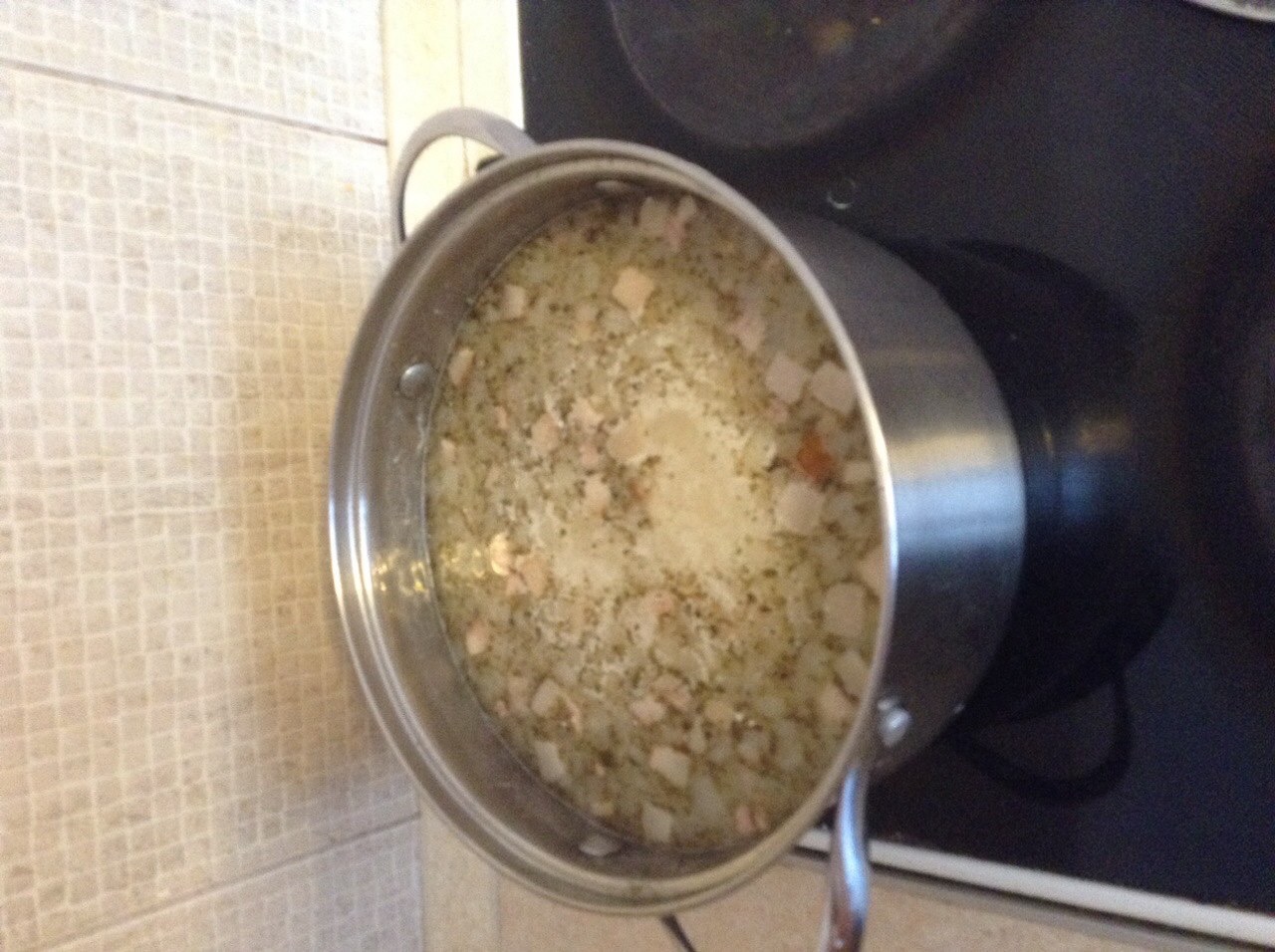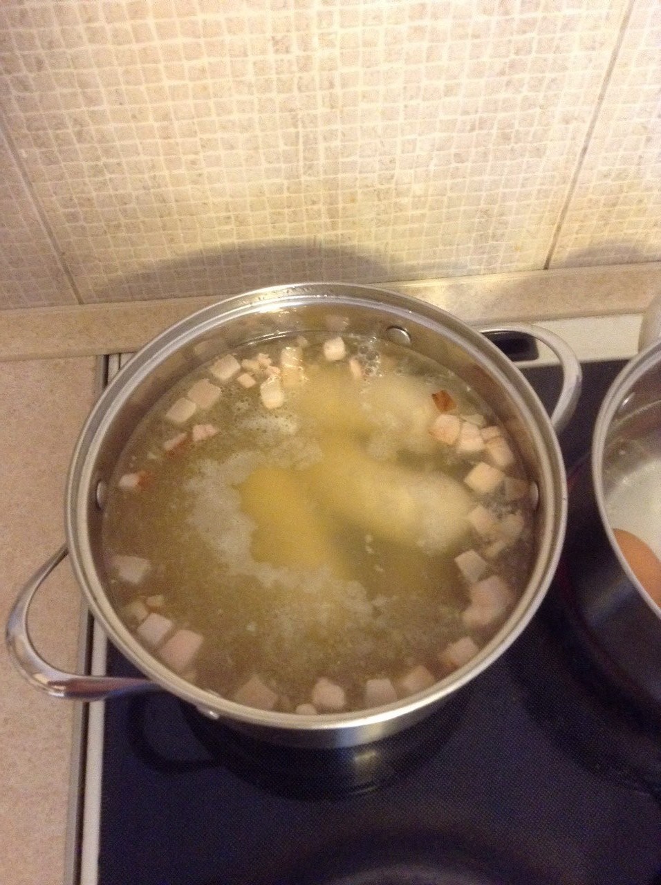 Когда бульон готов, на арену вышла грудинка. Она была порезана кубиками и отправлена на сковороду. После того, как с нее начал вытапливаться жир, туда же последовал и лук. На скороде они в органичном союзе провели некоторое время, пока не приобрели слегка золотистый цвет. Как вы понимаете, искусство не терпит формальных рамок и время я не засекал. Кстати, настолько увлекся процессом, что забыл зафиксировать этот этап для потомков.